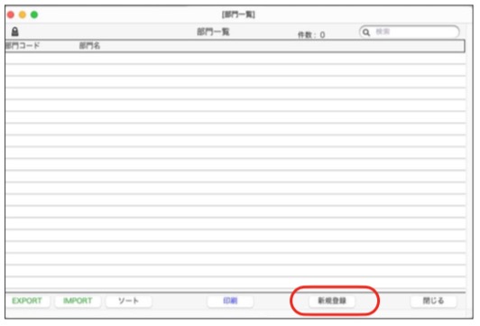 一覧画面の「新規登録」ボタンをクリックすると、部門登録画面を表示します。