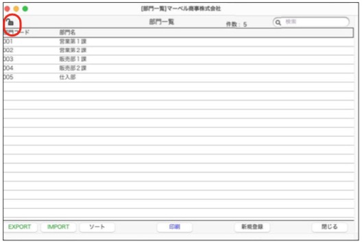 登録済みの部門マスタを修正、追加する場合は部門一覧画面の左上鍵マーク をクリックし 解除します。