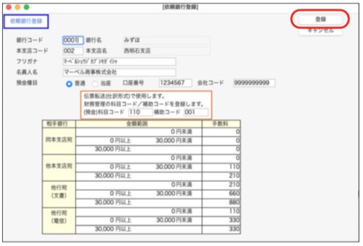 ●依頼銀行(自社の取引銀行で、各支払先に振込を依頼する銀行)について、口座番号や、手数料を登録します。
