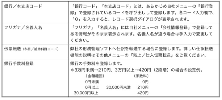 ここで登録するのは、自社の銀行口座及び振込手数料の内容です。郵便局振込先もここで登録します。