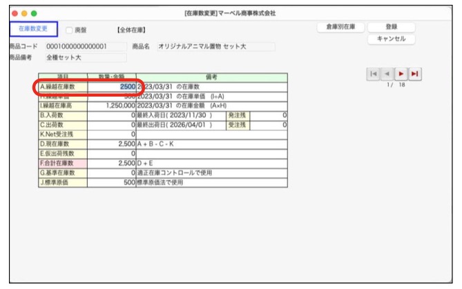 導入日時点の在庫数を「A.繰越残高(全体繰越在庫)」等を入力します。
