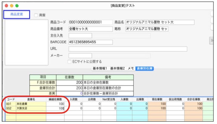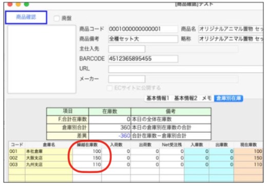 1.各商品マスタの倉庫別在庫に登録した倉庫がセットされた状態であるか確認します。