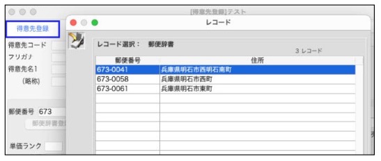 郵便辞書登録から参照し、レコード選択画面から住所の入力が行えます。