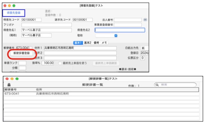 1.得意先・仕入先マスタ入力で、郵便番号、住所(住所1)に入力した段階(丁目、番地のように詳しい住所を入力する前)で、郵便辞書登録ボタンを1回クリックします。