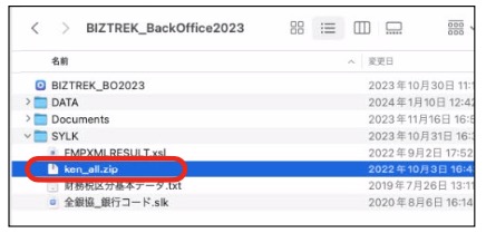 ファイル画面を表示します。「BIZTREK_BackOffice202X」フォルダ=>「SYKLK」フォルダ 「KEN_all.csv」ファイルを選択して開きます。