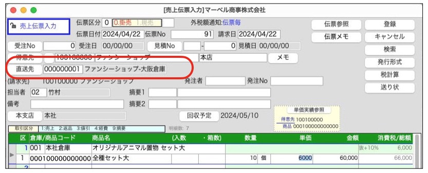 2.受注/売上伝票にて得意先を選択した際、得意先マスタで設定した直送先が自動選択されます。