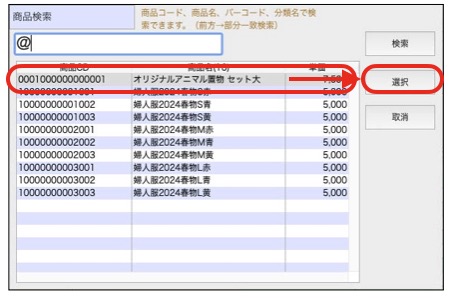 選択すると、商品が一覧に追加されます。「インストアコード」(「BARCODE」)を入力します。