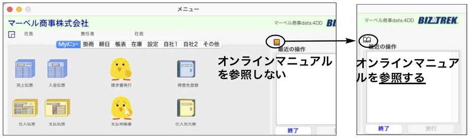 ご使用中のメニューで不明な点がある場合などに、そのメニューを開いた時点でオンラインメニュアルが表示されます。操作方法は下記の通りです。