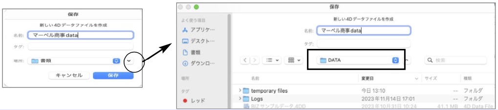 保存先:「ハードディスク」→「アプリケーション」→「Marvel」フォルダ→ 「BIZTREK_BackOffice2023」フォルダ→「DATA」フォルダに変更します。