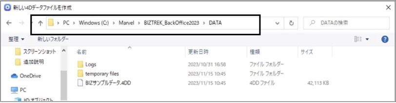 保存先:PC (マイコンピュータ)→   Windows(C:)→「marvel」フォルダ→「BIZTREK_BackOffice2023」フォルダ→「DATA」フォルダに変更します。
