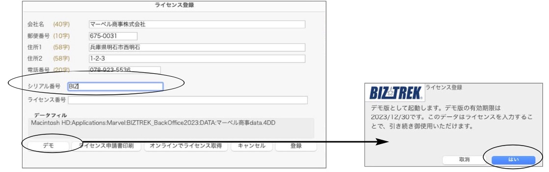 後日、ライセンス通知書をご郵送させていただきます。ライセンスが届く迄の間は 「デモ」のボタンより60日間はデータを開き、データ入力が可能です。