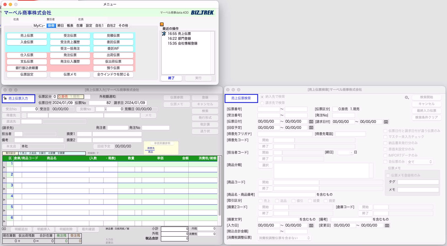 *ディスクトップ上には、新規伝票入力画面、売上伝票検索画面と同時に2画面で同じメニューを操作可能です。
