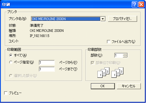 ●ページ指定ダイアログは、使用するプリンタによって違いますが、おおむね『印刷部数』『印刷頁範囲指定』、『プレビュー(印刷帳票を画面に表示)』などが設定できます。