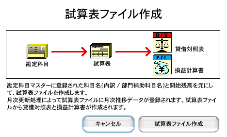 5 .次に[試算表ファイル作成]の画面を表示します。「試算表ファイル作成」のボタンをクリックします。(キャンセルボタンをクリックすると、開始残高の登録はキャンセルされます。 開始残高の登録は何度でもやり直せますので、この画面でキャンセルにしても意味はありません。)
