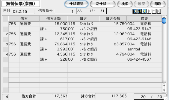 伝票検索後、1.参照画面の「仕訳転送」「逆仕訳」 ボタンで同じ(または借方/貸方逆の)仕訳を伝票画面に表示します。