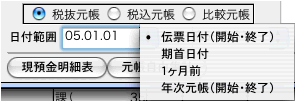 伝票入力や伝票検索画面の「元帳参照」では、日付の手入力もできますが、プルダウンで日付範囲を指定することができます。