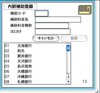 [登録]ボタン.................入力内容を登録、補助科目選択画面に戻ります。一覧から補助科目を選択します。