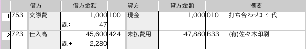 例:「010」に「打ち合わせコーヒー代」という摘要が登録されている場合。