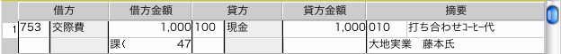 "010" →フルキーenter(return)を入力すると、摘要コードの右に 「打ち合わせコーヒー代 」と表示されます。