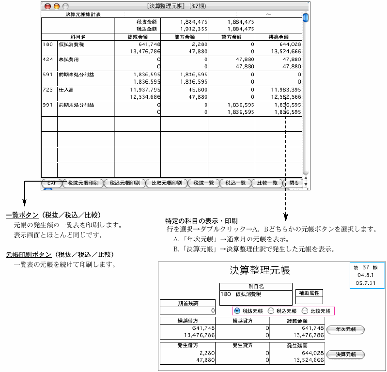 ・ 代表科目、補助科目、代表補助科目両方の集計レベルの選択後、"決算整理元帳"ボタンをクリックします。