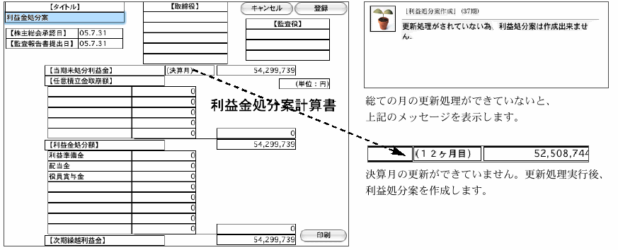 この「利益処分案作成」メニューは、外部報告用の財務諸表(決算報告書)に添付するための書類を作成するだけのものです。