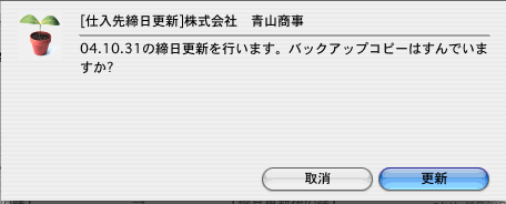 ●締日更新は、やり直しができません。更新時の日付の間違いや、エラーに備え、前もって必ずバックアップコピーをとってください。もし、締日更新に失敗して、バックアップコピーがなければ、もう一度正しく締日更新を行った後で、得意先の前々回残高の修正入力が必要です。