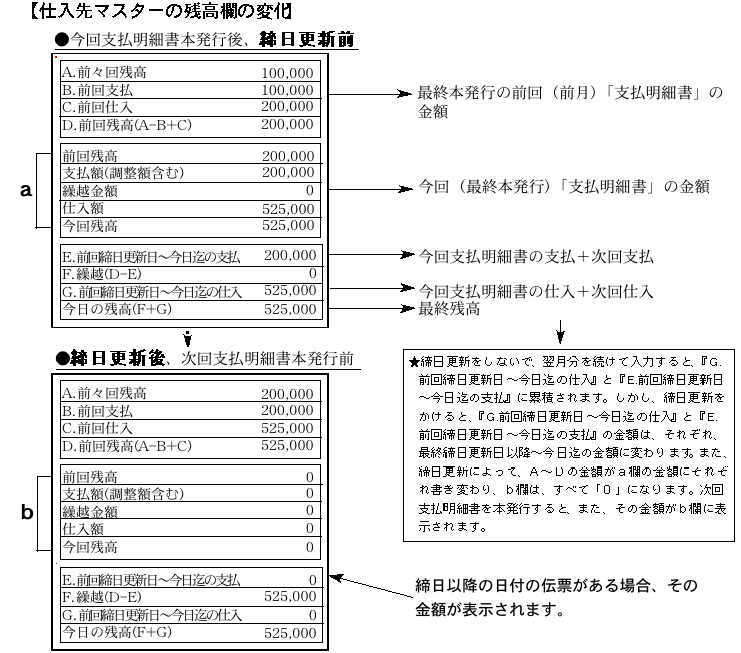 ●締日更新を行うと、支払明細書a欄『前回残高』は、『A.前々回残高』に、仕入額と支払額は『C.前回仕入』『B.前回支払』にそれぞれ繰り越されます。a欄の『今回残高』は 『D.前回残高』に繰り越されます。『未払残』の各項目についても同様です。