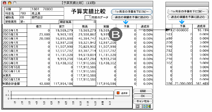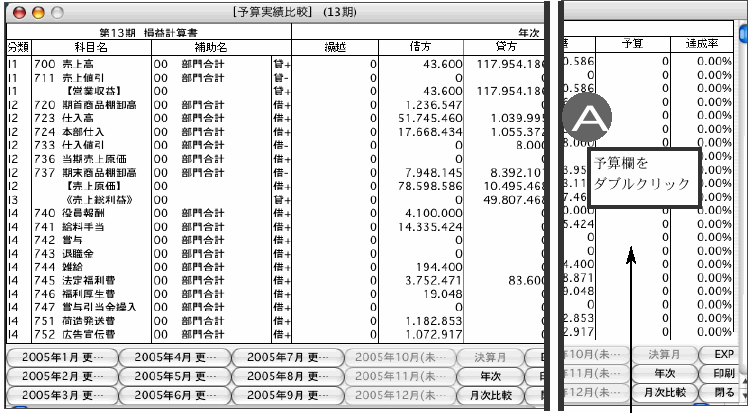 予算欄(A)をダブルクリックすると、月毎の実績と予算を表示します。