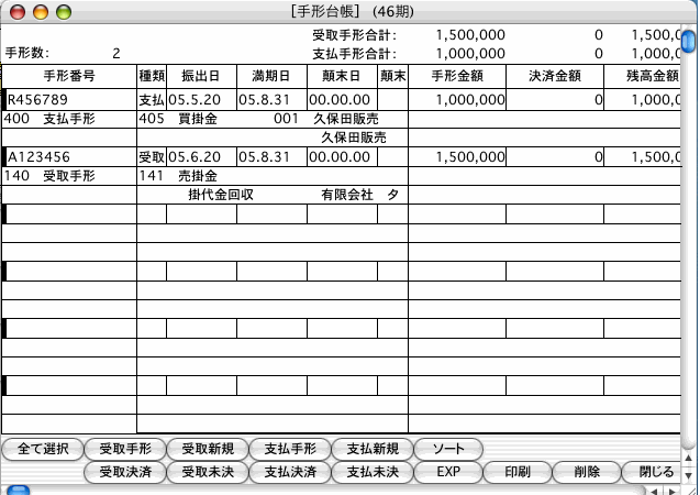 [手形台帳]....受取・支払手形両方を表示します。ここから手形の新規登録ができます。