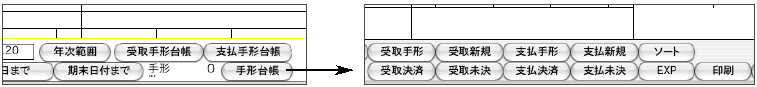 ・手形管理設定画面で日付範囲入力後、「受取(支払)手形台帳」 または 「手形台帳」ボタンをクリックします。