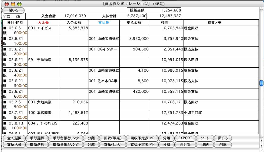 財務管理の資金繰シミュレーションメニューーで、Exportした回収・支払予定表のデータを読み込めば、予定表を個々に入力する必要はありません。