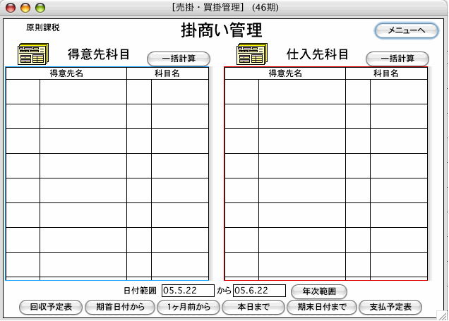 伝票入力した売掛金・買掛金の補助コードと、得意先・仕入先で登録した科目コード・補助コードをリンクさせて、回収予定・支払予定表を作成することが出来ます。(請求回収方法の締日・回収予定日の入力を元にデータを作成します) 得意先・仕入先の締日設定は、別売『販売仕入』と同様に、月3回迄できます。 「売掛・買掛管理」メニューの日付設定後、"一括計算"→"回収予定表"の順にボタンをクリックします。 いつ、どこから(どこに)、いくら入金(支払)という内容の、回収予定(支払予定表)を作成・表示します。