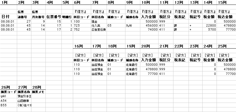 =仕訳日記画面からEXPORT後、表計算ソフトで開いた画面=