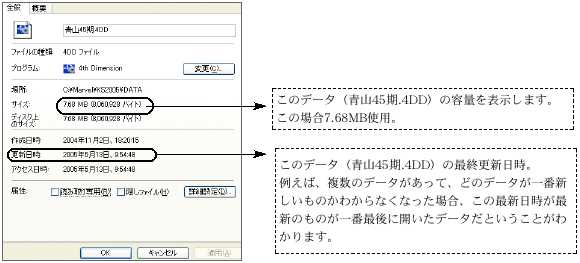 には、お客様が登録されたマスターや、伝票データ等が保存されています。バックアップコピーをとるときには、ハードディスクにデータの容量(「○○.4DD」と「○○.4DR」の合計)以上の空きがないと、コピーできません。 容量をみるには、それ ぞれのアイコンを1回クリックして反転させ、ファイルメニューから、「プロパティ」を選択します。