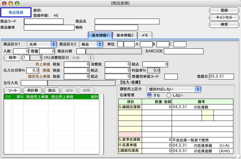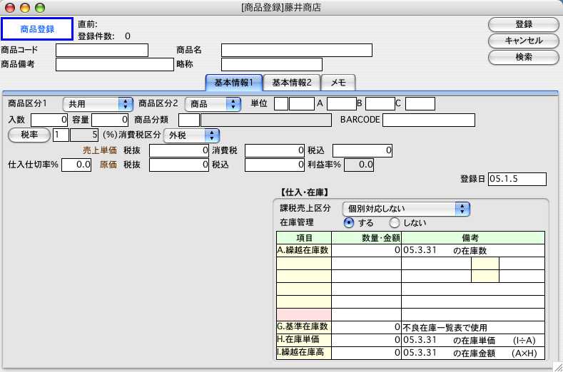 ●最新の在庫状況を確認できます。繰越在庫、基準在庫数、在庫単価、繰越在庫高は手入力できます。それぞれの項目については、商品登録画面の説明を参照してください。