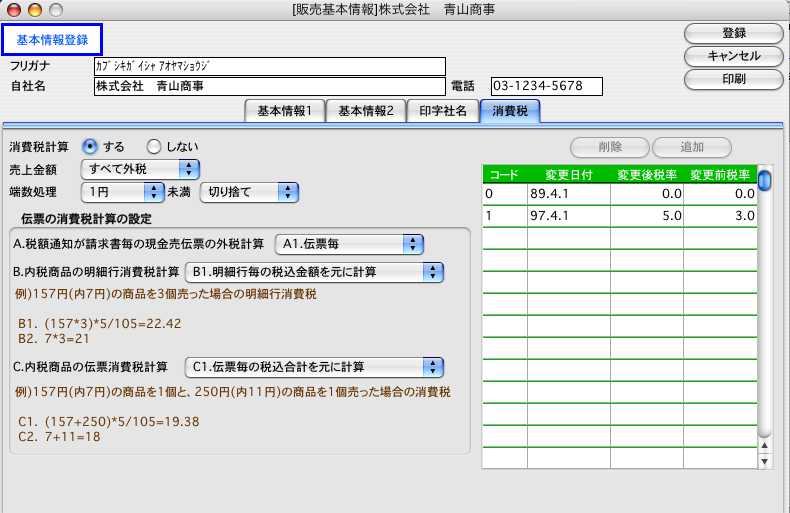 ●将来、税率が変わった場合にも対応ができるようになっています。税率をコード化し、それぞれに変更日、変更前税率、変更後税率が登録できます。導入時は、現在の税率(コード0→非課税。コード1→課税)がすでに登録されていますから、何もする必要はありません。