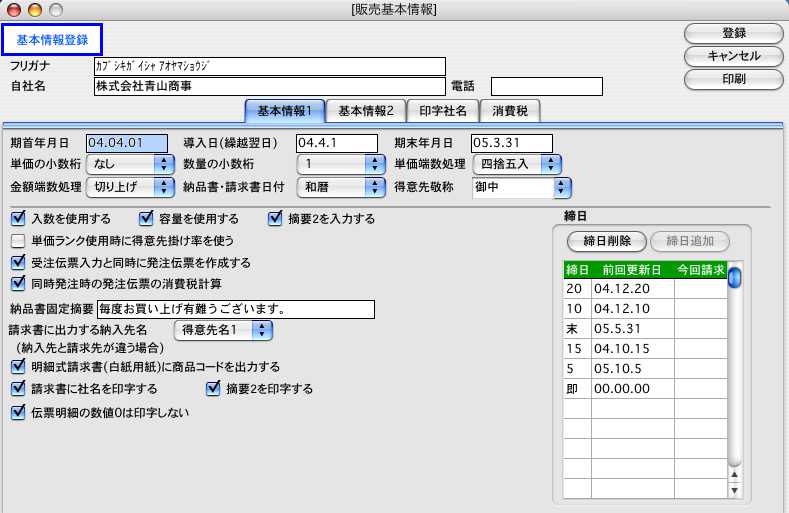 ●納品書と請求書に印字する会社(自社)名を登録します。納品書社名から請求書社名 (又はその逆)へのコピ−は、編集メニュ−のコピ−、ペ−ストを使用して1行単位で行ないます。