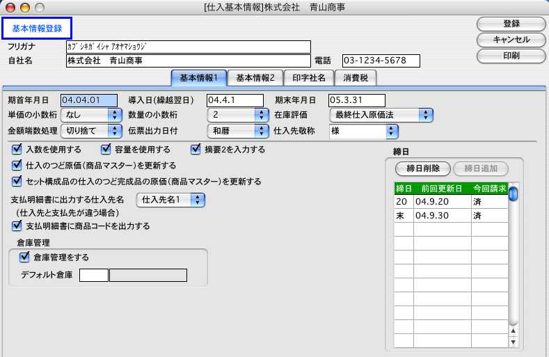 ●自社名や期首日付など、『販売仕入スタンダードPRO』全体に共通の 自社の情報 や、『仕入管理』処理の基本となる項目を登録します。