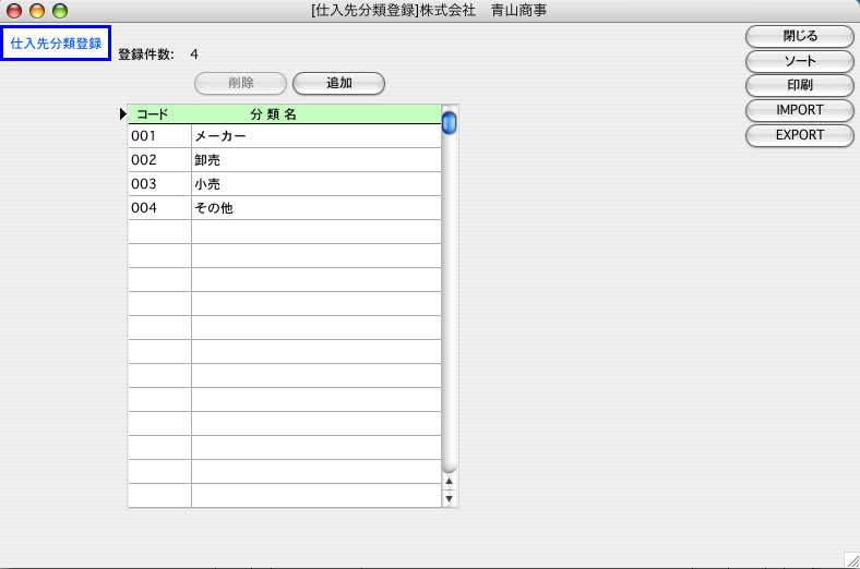 ●仕入先を分類する為の、分類コードを登録します。仕入先分類ごとに仕入管理表を出力することができます。不要の場合は省略してもかまいません。