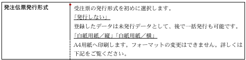 発注伝票の発行形式を設定します。発行形式を一度変更すると、次に変更するまで有効です。