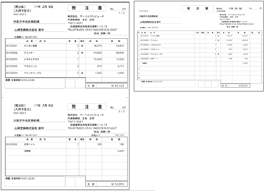 発注日別/仕入先別/支払先別/商品別の明細表を、A4白紙単票用紙に印刷します。