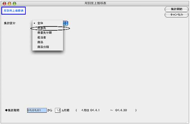 1.集計区分(全体/得意先/得意先分類/担当者/商品/商品分類)をポップアップメニューから選択します。区分が「全体」以外の場合は、マスターの開始コード・終了コードを指定できます。