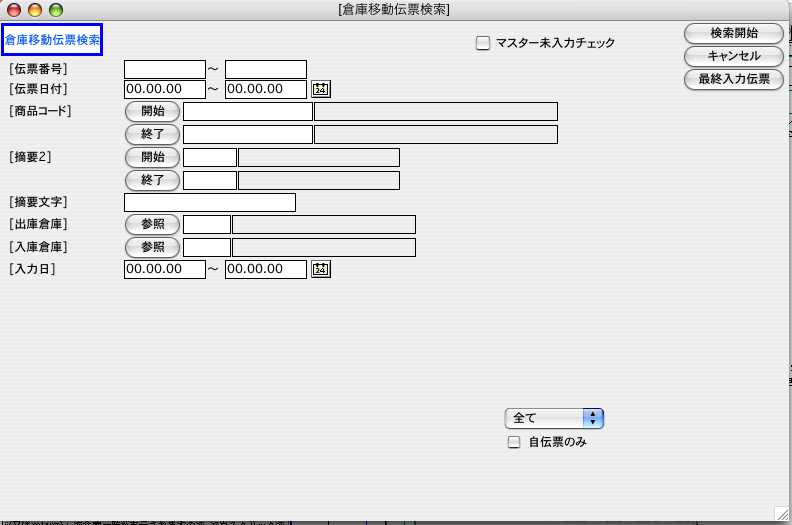 2.倉庫移動伝票検索画面が表示されます。検索条件を入力し、「検索開始」ボタンをクリックします。