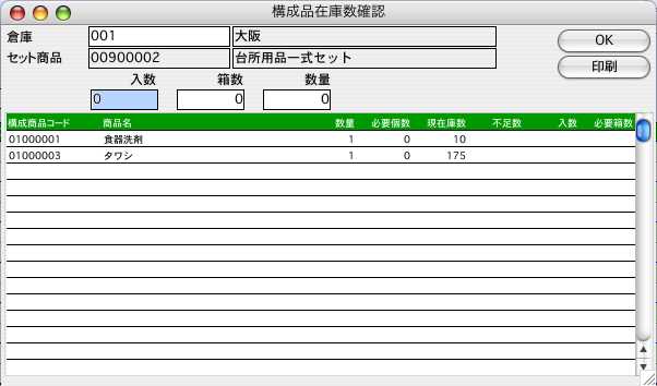 3.商品選択後にセット商品の構成品の現在在庫数を表示します。このダイアログで数量等を入力し、「OK」ボタンをクリックします。※構成品が何個必要なのか何個足りないのかを確認できます。