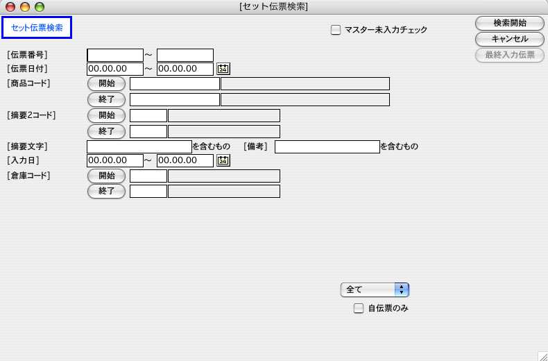 2.セット伝票検索画面が表示されます。検索条件を入力し、「検索開始」ボタンをクリックします。