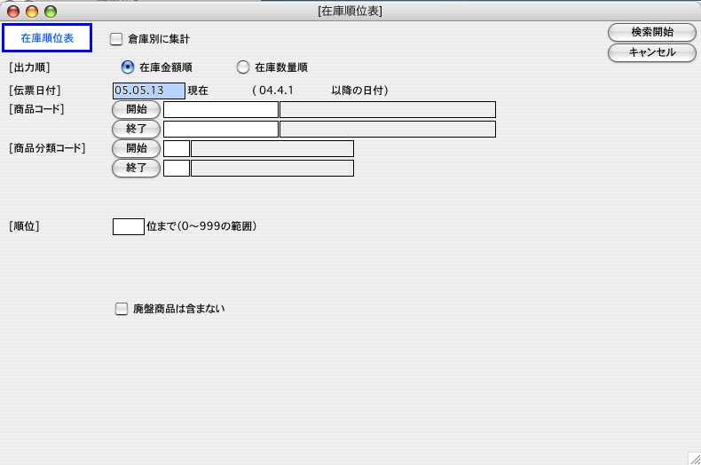 ●指定日現在の在庫順位帳を、在庫数量または金額の多い順に出力します。999位まで、順位の指定が可能です。順位外の在庫は「その他」に一括して集計されます。