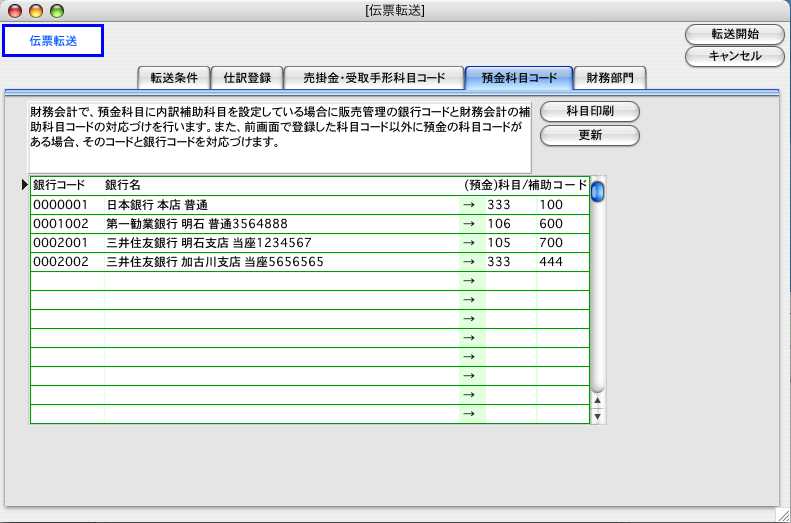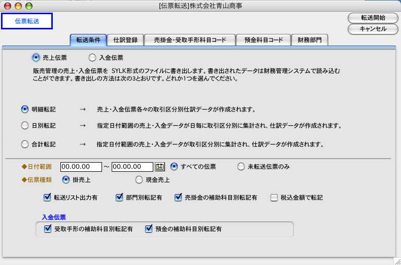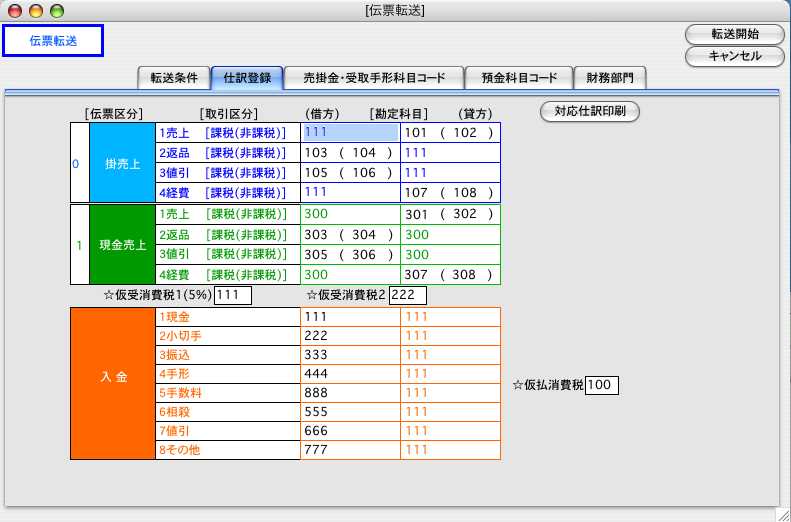 ●伝票転送画面の1項目の「売掛金の補助科目別転記有」の欄にチェックすると、伝票転送画面の3項目で 指定した得意先-補助科目対応表に従い、売掛金の補助科目コードが書き込まれます。チェックをはずすと、売掛金の補助科目は空欄になります。この場合の売掛金コードは3項目で指定したコードが使用されます。(この場合3項目の設定内容は、関係ありません)「受取手形の補助科目別転記有」「預金の補助科目別転記有」についても同様です。