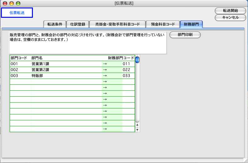 ●『販売仕入』と、『財務管理』ソフトの部門の対応づけを行います。すべて同じ場合でも同じコードを入力してください。『財務管理』ソフトで部門設定をしていない場合は、財務部門コードを空欄にしておいてください。