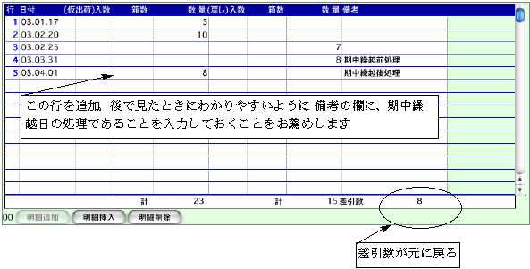 (3)続けて次の行に、期中繰越日の翌日の日付で、先程戻した数と同数を仮出荷数の欄に入力します。この例ですと、期末の戻し数「8」を[2003.4.1]の日付で仮出荷し、差引数を再び「8」にしています。