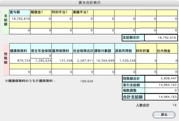 支給、控除の各項目毎の合計が、画面に表示されます。
